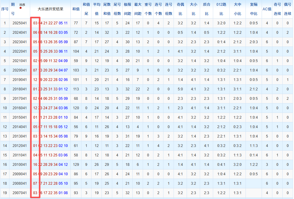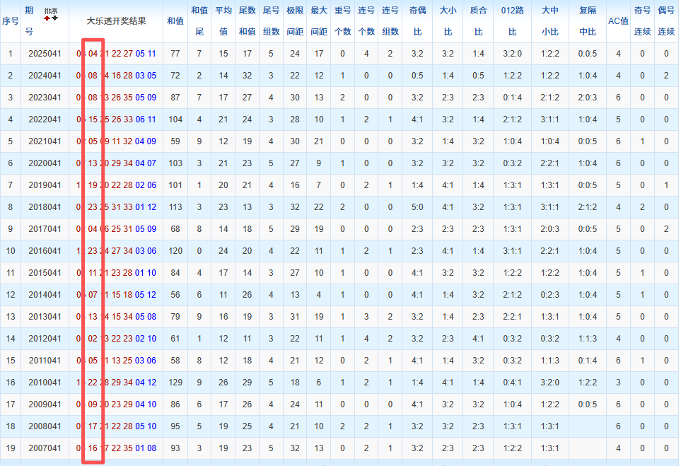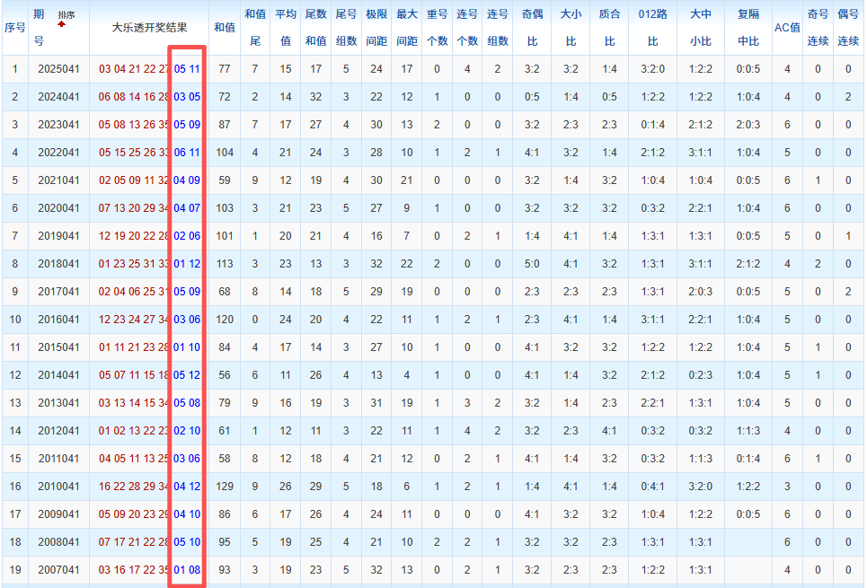 通过观察,我发现往年同期的开奖数据与本期号码之间存在显著关联。具体来说,在前区号码中,从第一位至第五位,通常会有约三个位置上的数字与往年同期相同位置的号码一致;而后区号码中,也有多期开奖结果直接包含了往年同期的数字。因此,我们可以借助往年同期各位置上的号码,作为分析本期开奖情况的重要依据。在此基础上,还可结合往年同期的其他相关条件,进行综合性的号码组合推荐。