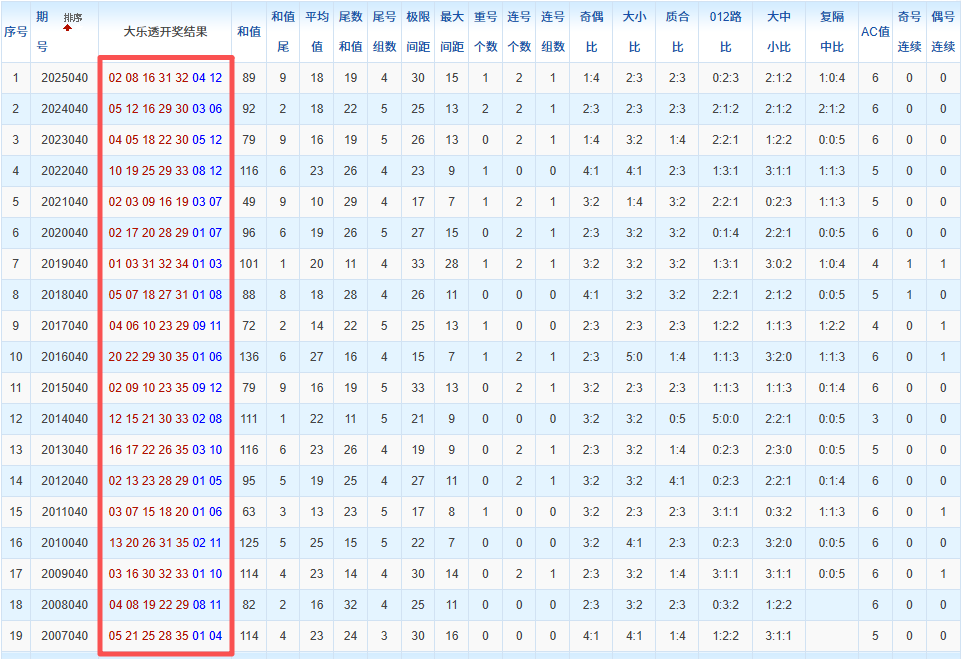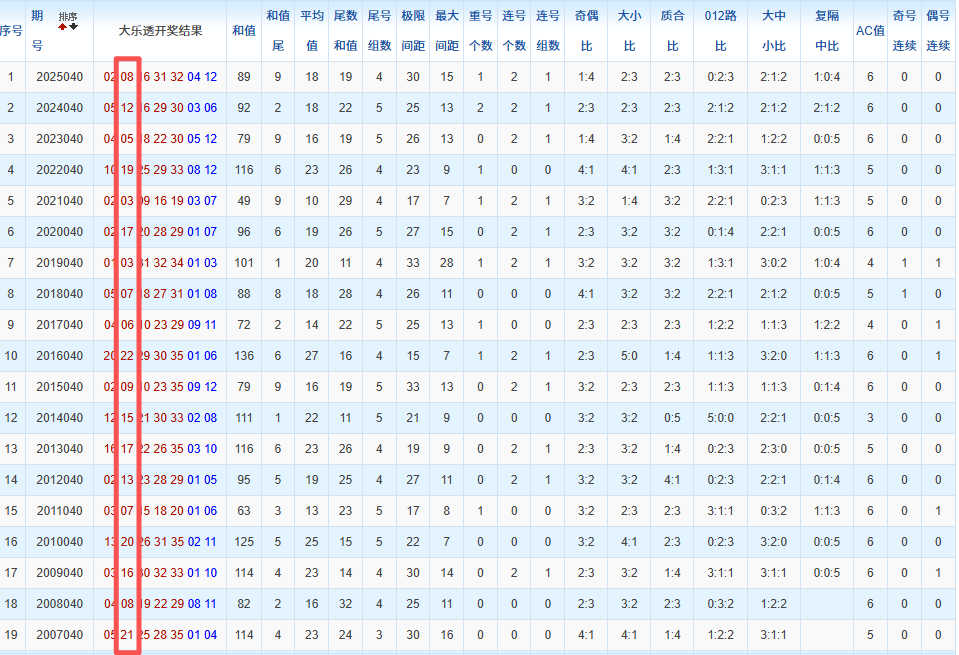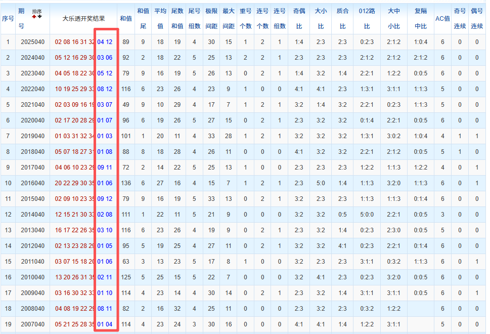 通过观察,我发现往年同期的开奖数据与本期号码之间存在显著关联。具体来说,在前区号码中,从第一位至第五位,通常会有约三个位置上的数字与往年同期相同位置的号码一致;而后区号码中,也有多期开奖结果直接包含了往年同期的数字。因此,我们可以借助往年同期各位置上的号码,作为分析本期开奖情况的重要依据。在此基础上,还可结合往年同期的其他相关条件,进行综合性的号码组合推荐。