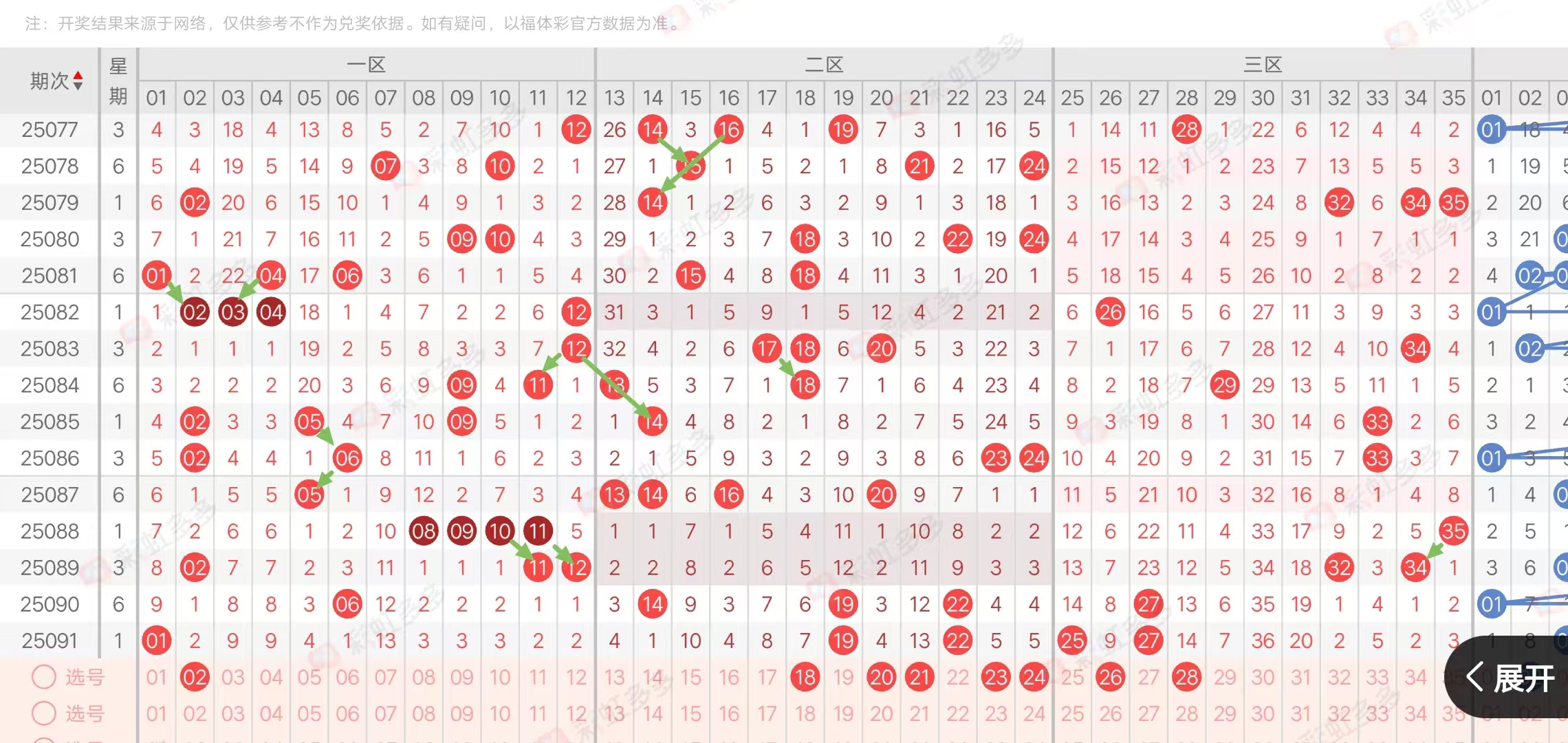 再看二区,近期出号个数为212,0223,03,02132233132,032124,0032,近期规律出2枚后多出2-3枚,本期重点2枚,防3枚,