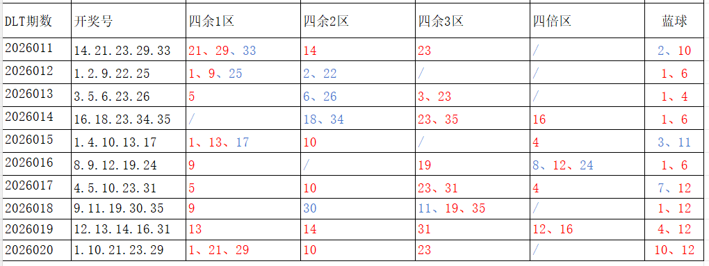 分享第一个数据分析:四分区统计数据。相对于传统的三分区,个人习惯使用四分区,就是把35个红球号码除以4,所得的余数分区如下: