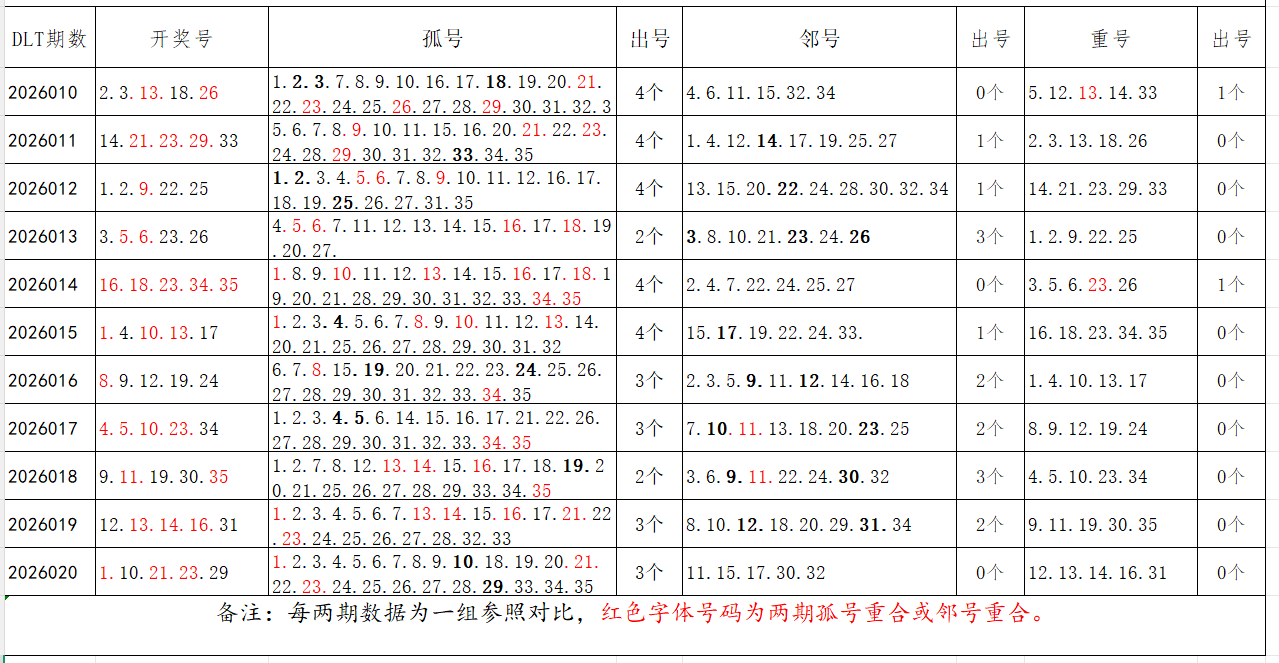 如图,以近两期数据为一组,进行对比分析,相同的孤号、邻号可能在下期开出。本期参考孤号:3.4.5.6.7.8.12.13.14.15.16.17.18.19.25.26.27.31.32.33.34.35;邻号:2.9.11.20.22.24.28.30。重点关注:孤邻号重合号码:***(会员专区可见)。个人分析,仅供参考。