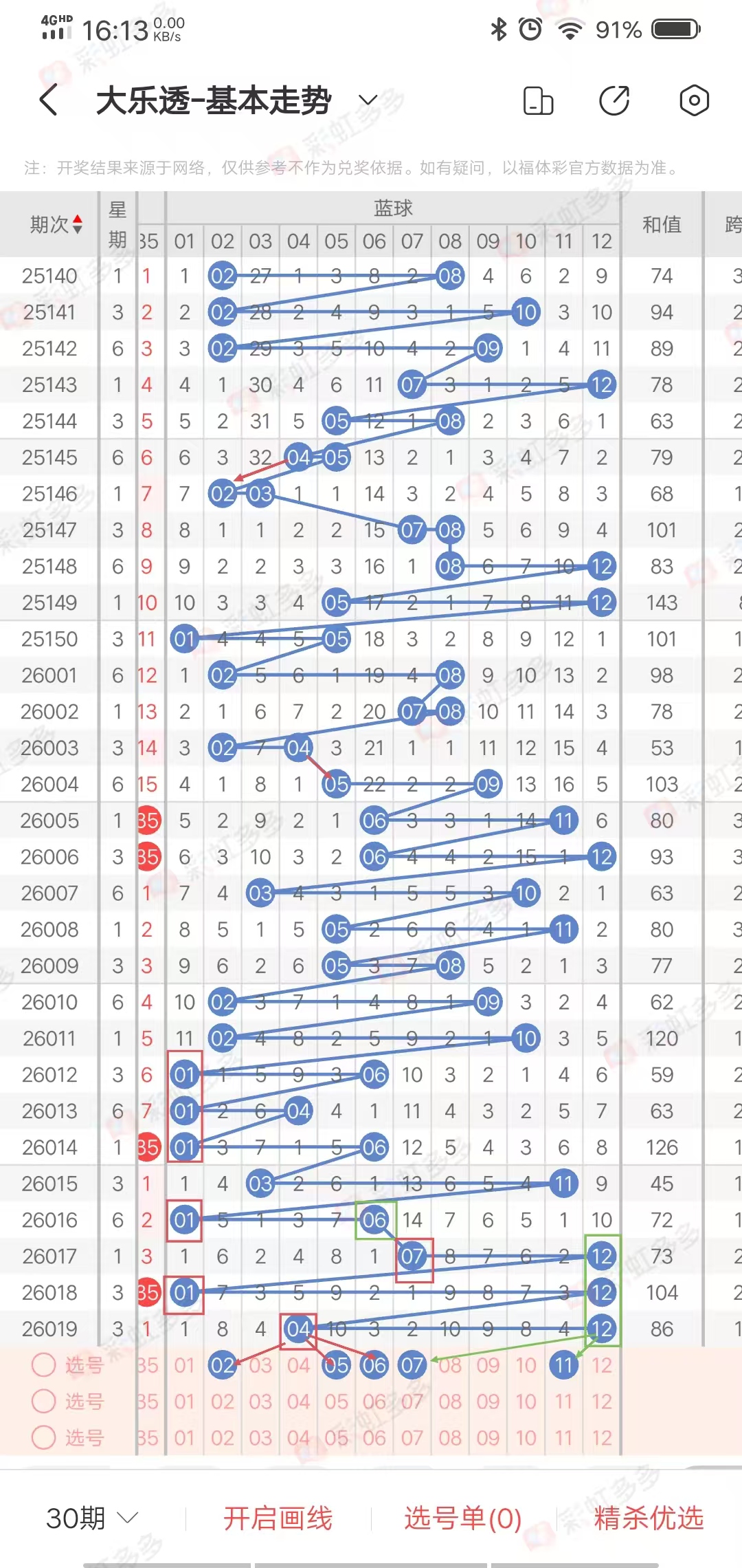 再看近期后区和值幅度走势