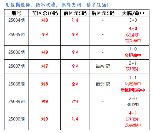 上期前区杀10码对8,杀5码对4,双胆对1,后区杀5码全对,大底命中1+1,本期再接再厉!