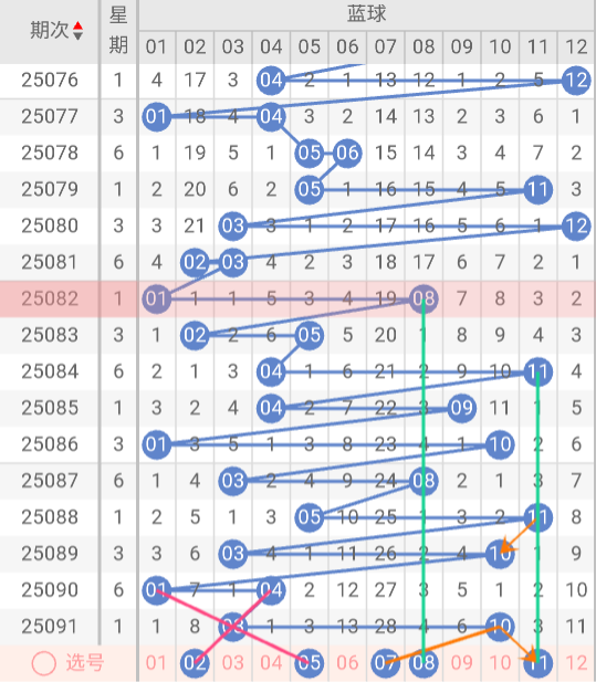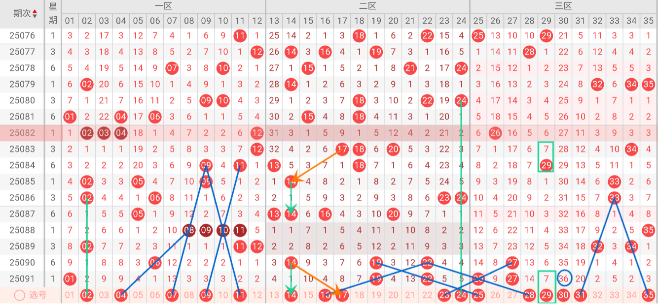 三区(25-35)分析:上期该区开出号码 25 27,近10期占比22%,与上期相比+4%。本期无三斜连号趋势,无隔码斜连走势。三区近10期8次≤1码,实属罕见冷态,本期大概率持续冷态延续,本期可能出号0-1枚。推荐关注号码:25、28、29、31、35。