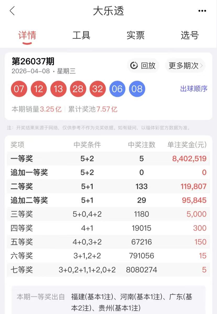前区奖号开出2个重号,连号开出1个,奇偶比为2:3,跨度为25,三个区间比为2:1:2,后区开出1个重号。