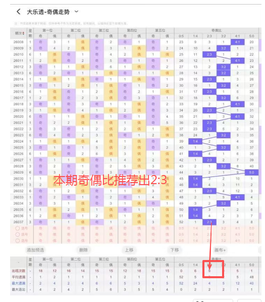 4、奇偶比:上期开出2个奇数,出3个偶数,奇偶比为2:3,整体看偶数强势,本期关注偶数出号,本期推荐出2:3。