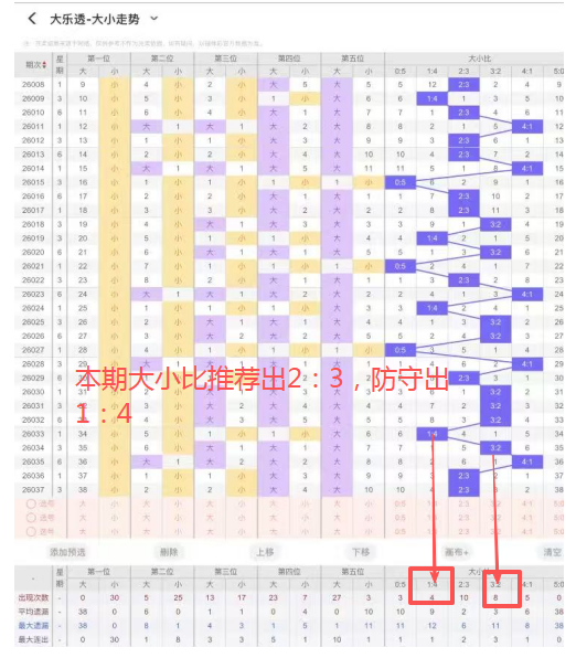 5、大小比:上期开出大小比为2:3,近120期开出4:2出现25次,3:2出现53次,2:3出现52次,1:4出现31次,5:0出现4次,本期推荐出3:2。