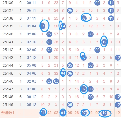 上图是体彩大乐透后区开奖号码分布走势图,我在上面图中标注的数字是1路球数字,这里的1路球数字是后区号码除以3余数是1的1路球数字01 04 07 10,可以发现我在上面标注出来的蓝色圈圈都是1路球数字,最近1路球数字出现的少,那么本期个人觉得可以关注1路球数字01 04 07 10出1个或者2个。