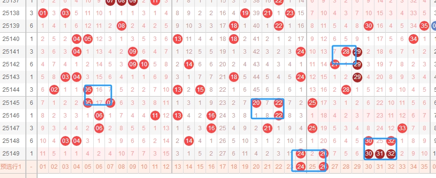 上图是体彩大乐透前区开奖号码分布走势图,我在上面图中标注的蓝色框框是最近前区号码之间的特点,可以发现的就是上面出现了20 22或者05 07还有27 29还有上期出现了30 32其中总有一个数字会重复的,那么上期出现了24 26本期个人觉得这两个数字应该关注出1个或者2个。