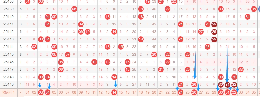 上图是体彩大乐透前区开奖号码分布走势图,我在上面图中标注的蓝色箭头最近好吗之间的特点,上期出现了两个遗漏周期大的数字分别是26遗漏周期20期,31遗漏周期25期,那么本期可以关注遗漏周期小的数字,隔一期的数字03 04 14 还有重复好吗24 26 30 31 32这些遗漏周期小的数字个人觉得可以关注出2个或者3个。