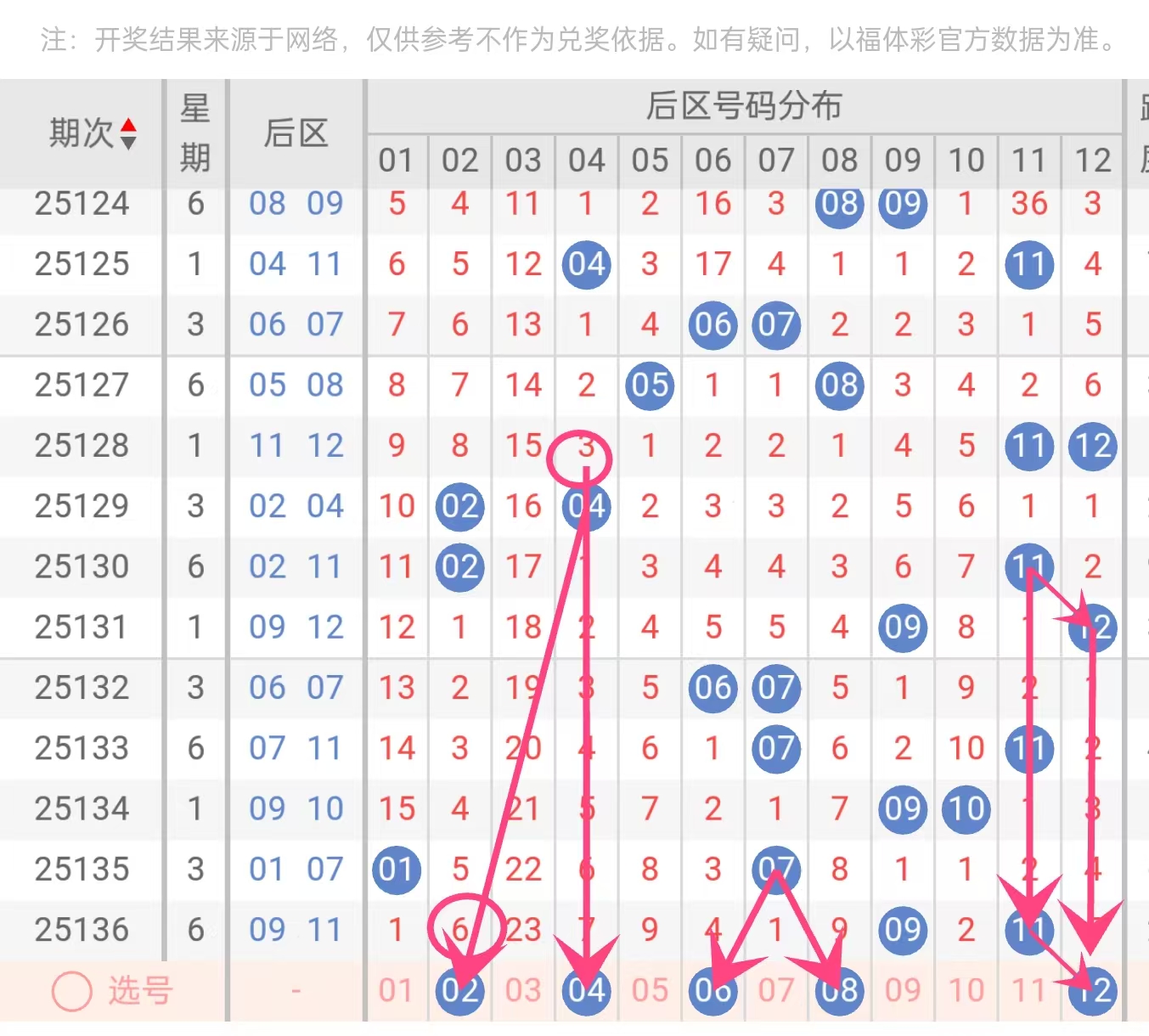 02和04:冷号,近5期未出现,小偶号,后区小号长期遗漏,反弹概率高,且偶号有助于平衡奇偶比。