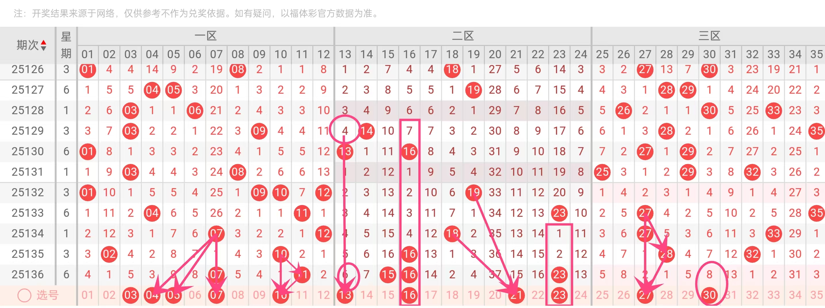 区间分布:前区1-12区间出现较多(如01、02、04、07、09、10、11、12),13-17区间相对冷清(仅15、16出现),18-35区间则集中在23、27、28、32、33、35。下期可重点关注13-17冷区间和18-25温区间。