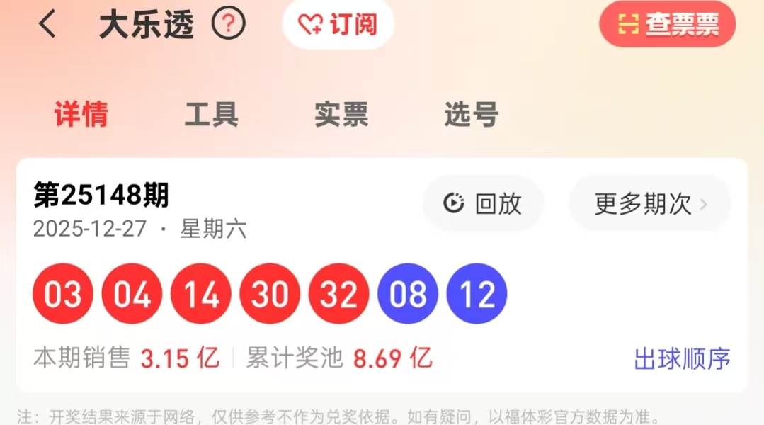 上期大乐透开奖结果:03.04.14.30.32+08.12