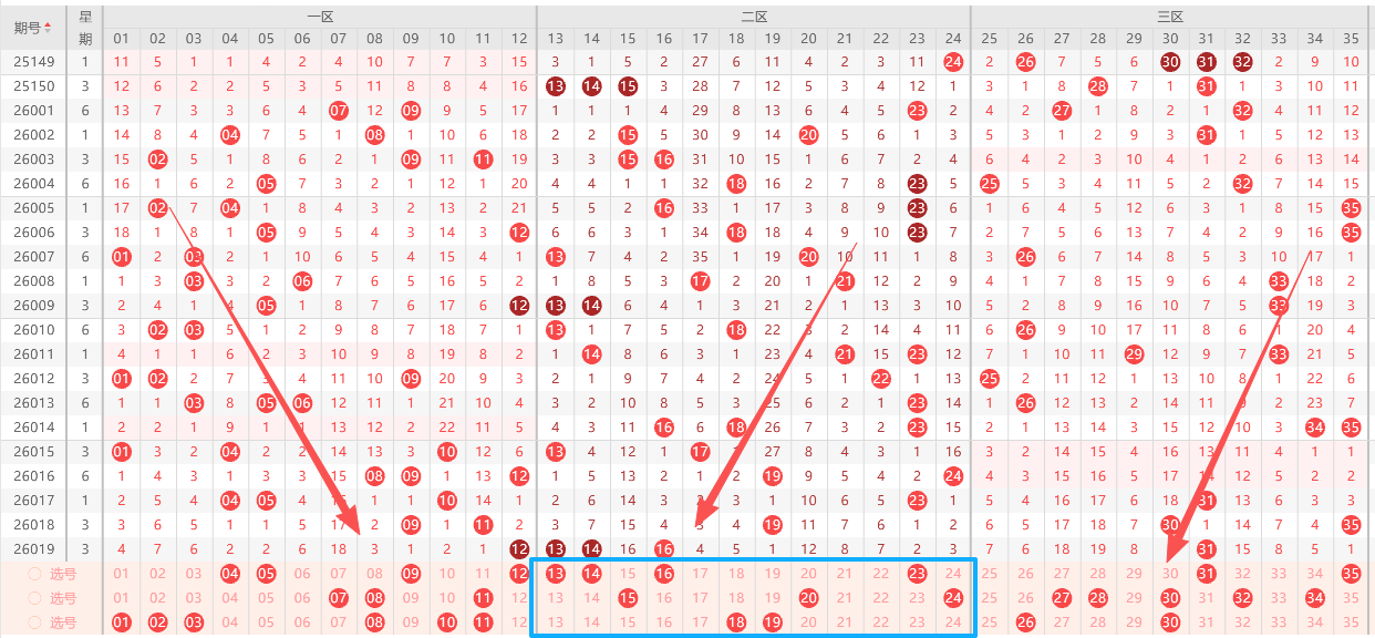 第三区:本期的凤尾,可以考虑30和32,33几个号码,3区号需要考虑26和27这几个号码。