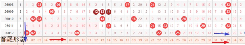 如图所示:首尾制约平衡组范围依次为:推缩推,推推? 本期形态范围优先选择红色右推首尾。由于上期号码处在首尾换4然后中间右推本期交换首尾移动空间连续分割形成间隔1正在重复走势预计本期继续形成走势,本期宜采取继续左推走势常规起号,或体现间隔1和邻码走势。