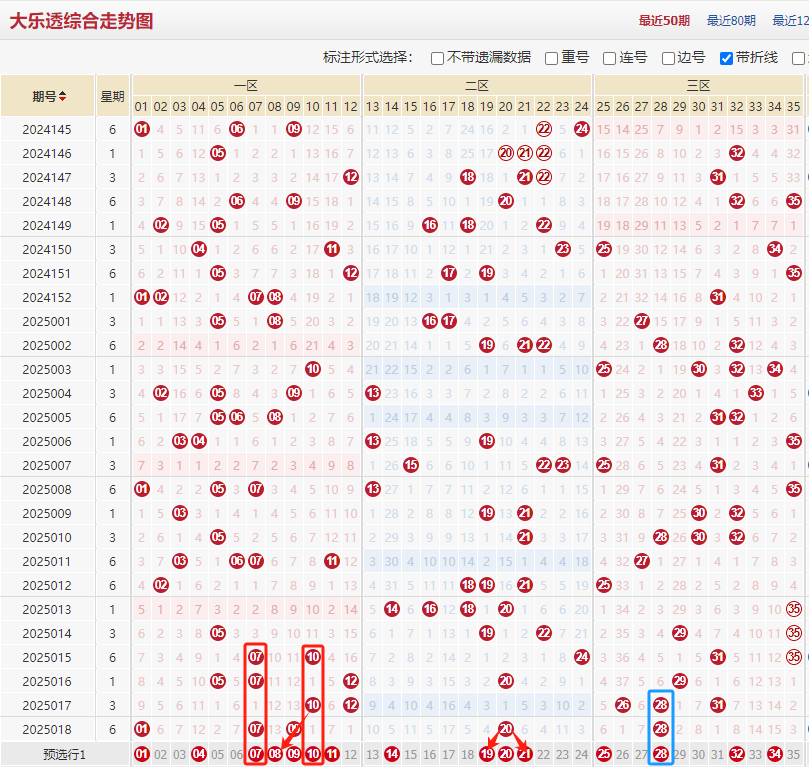 07(前区连开2期)、20(中区间隔号)、28(后区近期活跃)。