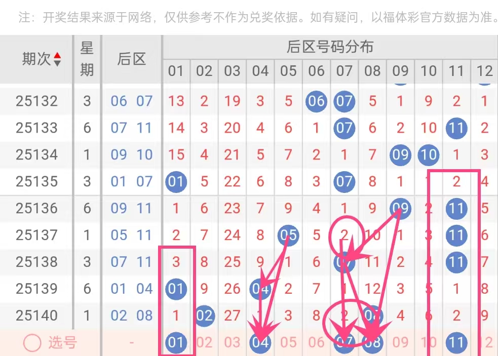冷热搭配:后区近期热号明显(01、04、07、08、11),冷号如03、06、10可暂时避开,集中选取热号与温号组合。