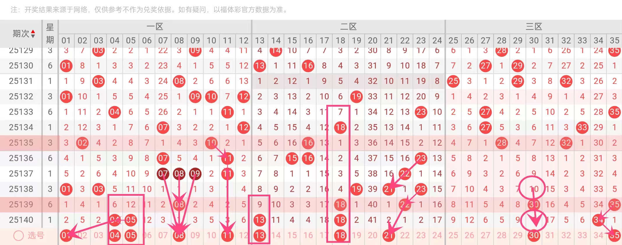 大号区选择性回补:30、34、35在近两期出现,尤其是35在2025139期亮相后仍有热度,30作为中后段过渡号,在近5期出现2次,走势平稳。大号区虽整体略显冷清,但个别号码如30、35仍有出号机会。