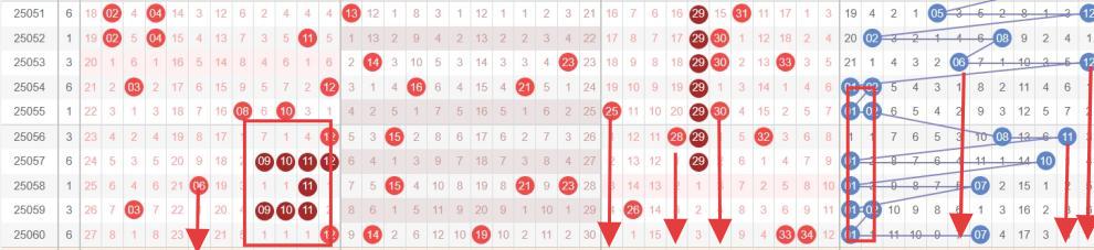 第一、我们要从超级大乐透的区间比、和值、跨度、奇偶比进行综合分析,结合历史以往开奖信息25061期红球走势大致方向分别为:区间比大致为3:1:1、3:0:2、4:0:1,跨度在22至26之间,和值在81至90之间,奇偶比在1:4或3:2。
