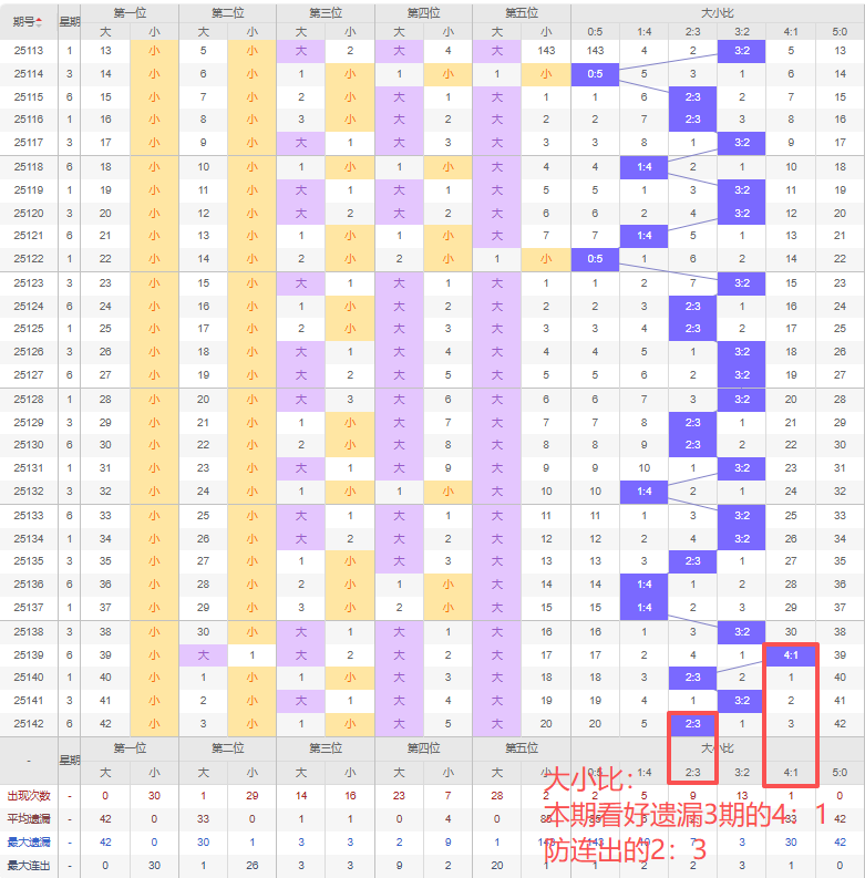 上期大小比:2:3,近10期大小比出现情况:3:2、3:2、2:3、1:4、1:4、3:2、4:1、2:3、3:2、2:3,最近10期出现4期3:2,出现3期2:3,出现1期4:1,出现2期1:4,出现0期5:0,出现0期0:5,根据近10期规律本期看好遗漏3期的4:1,防连出2:3,综上所述推荐大小比推荐:2:3,重点关注:4:1。