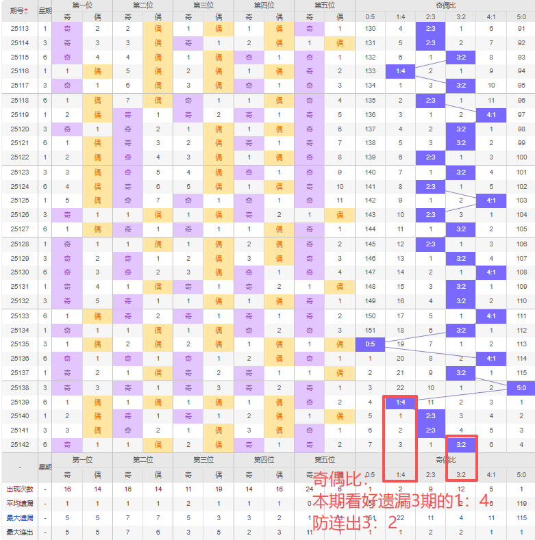 上期奇偶比:3:2,近10期奇偶比出现情况:4:1、3:2、0:5、4:1、3:2、5:0、1:4、2:3、2:3、3:2,最近10期出现3期3:2,出现2期2:3,出现2期4:1,出现1期1:4,出现1期5:0,出现1期0:5,根据近10期规律本期看好遗漏3期的1:4,防连出3:2,综上所述推荐奇偶比推荐:3:2,重点关注:1:4。