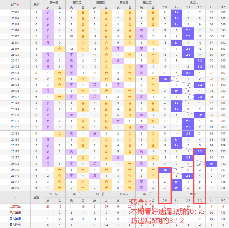 上期质合比:1:4,近10期质合比出现情况:2:3、1:4、1:4、3:2、2:3、4:1、0:5、2:3、1:4、1:4,最近10期出现1期3:2,出现3期2:3,出现1期4:1,出现4期1:4,出现0期5:0,出现1期0:5,根据近10期规律本期看好遗漏3期的0:5,防遗漏6期的3:2,综上所述推荐质合比推荐:3:2,重点关注:0:5。