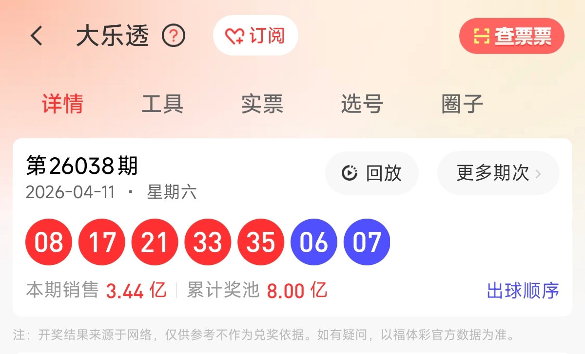 首先让我们回顾一下上期大乐透26038期的开奖为08、17、21、33、35,蓝球06、07 。前区和值114,前区跨27,区间比为1:2:2,奇偶比为4:1。
