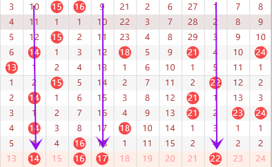第二区间,上期开出1个号码球的落位形态,二区间在经历几期温热之后,也在逐渐进行温冷号码球的落位回补。二区间需要关注16、17号码球,其次防守14、22号码球。通过在上期二区间开出的号码落位情况来看,本期我们首先要对二区间进行一个小范围防守,其次在走势极端情况下,考虑一下断区的可能性。