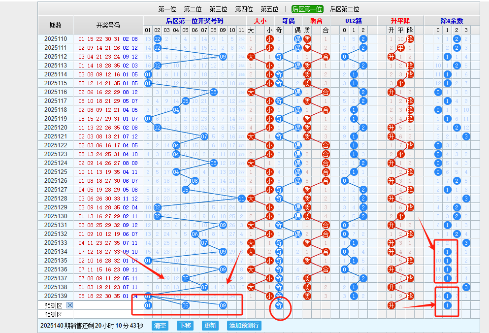 分析:近期后区第一位除4余数1重号明显,上期开出1,本期考虑重号,除4余1号码有01.05.09,重点考虑01-05