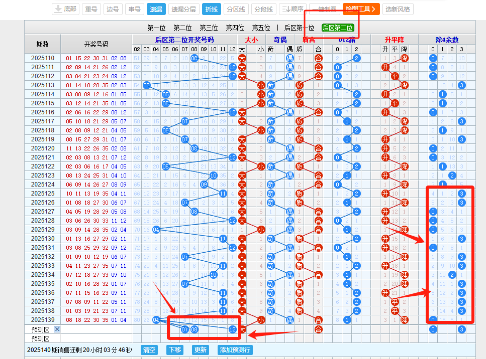 分析:15期后区第二位除4余数开出14期,持续走热,本期优先考虑大数及除4余0-3的号码,分别有07-08-12,重点推07