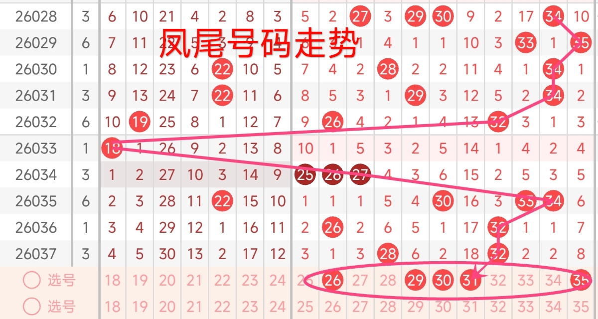 红球三区推荐(25~35):上期红三区开出2枚号码,号码为28、32,本期红三区建议出号1-2枚,本期红三区推荐关注号26、29、30、31、35。