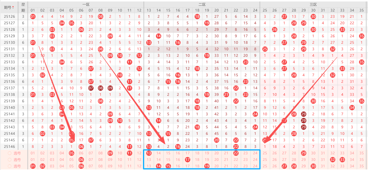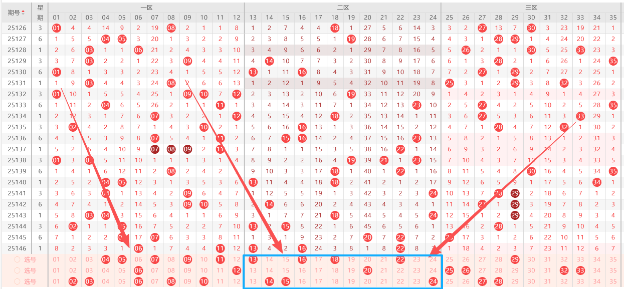 本期3区号码,总体分析如下(蝴蝶根据概率算法,结合大数据统计,总结出一套不错的算法,总体的3区分析如下):