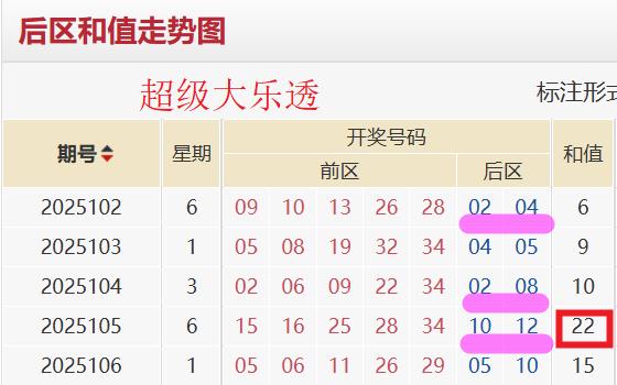 近五期大乐透开奖号码后区和值依次为6→9→10→22→15。后区和值均值为12。后区和值振幅为16,后区和值修正振幅为13。基于动态平衡干预以及波动趋势衡量,本期后区和值推测区间为3-23。基于风险对冲策略,本期后区和值区间缩水为6-18。