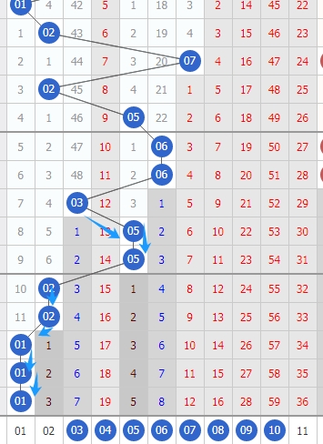 上面是体彩大乐透前区开奖号码走势分布图,我在上面标注出来的蓝色箭头都是遗漏周期小的数字,因为上期开出了数字34遗漏周期是23期,数字16遗漏周期是8期,数字35遗漏周期是7期,都是遗漏周期大的数字,那么本期应该关注遗漏周期小的数字,关注05 06 16 18 34 35出2个或者3个吧。