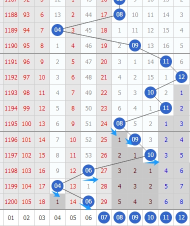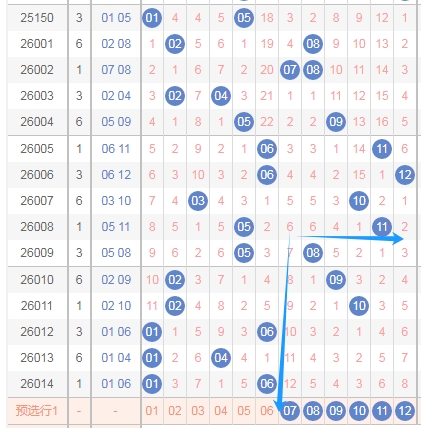 上图是体彩大乐透后区开奖号码走势图第二位数字走势图,我在上面走势图中标注出来的数字是我看好的,你们看看上面走势图中标注出来的蓝色小箭头就知道,跨度准备往右边走,那么本期可以看第二位数字07 08 09 10 11 12;