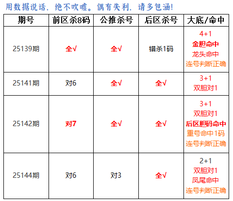 上期前区杀8码对6,公推前区杀4码对3,后区杀3码全对。会员文章中双胆对1,连号判断正确,凤尾命中。