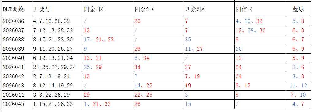 如图,红色字体是重复开出的号码,即为热号。蓝色字体是开出一次的号码,即为冷号。区间走势由冷及热,由热及冷,达到区间平衡。以近10期为一个分析周期:4余1区、4倍数区,走势较冷;4余2区、4余3区,走势较热。依据久热必冷,久冷必热的规律,本期重点关注:4余1区、4倍数区,区间号码可能开出2-3个;4余2区、4余3区,区间号码可能开出1-2个。区间冷热号码精选:***(会员专区可见)。个人分析,仅供参考。