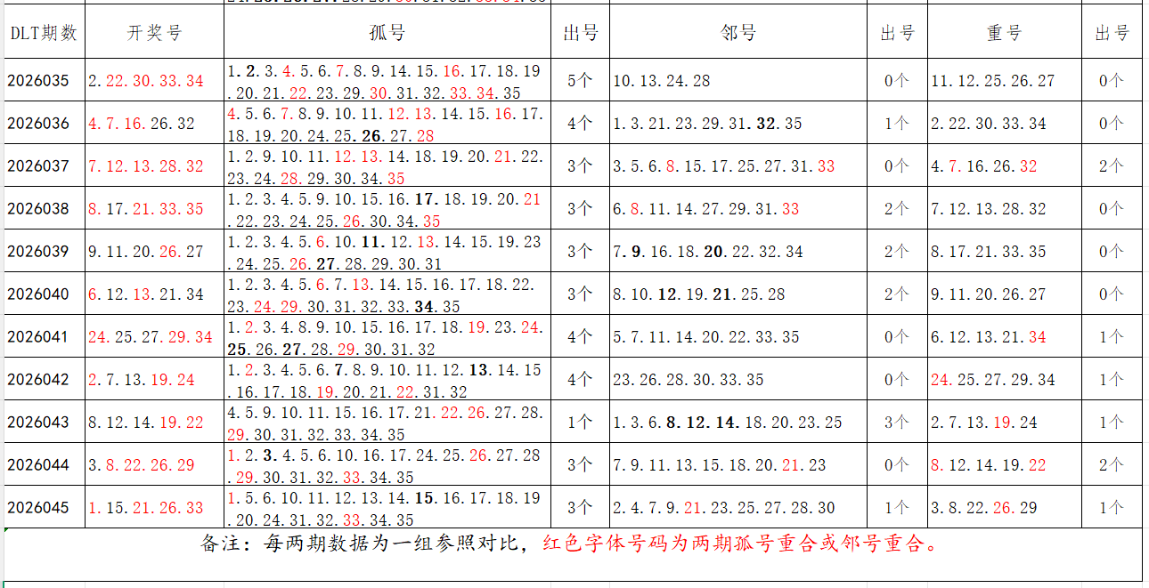 如图,以近两期数据为一组,进行对比分析,相同的孤号、邻号可能在下期开出。本期参考孤号:3.4.5.6.7.8.9.10.11.12.13.17.18.19.23.24.28.29.30.31.35;邻号:2.14.16.20.22.25.27.32.34。重点关注:孤邻号重合号码:***(会员专区可见)。个人分析,仅供参考。