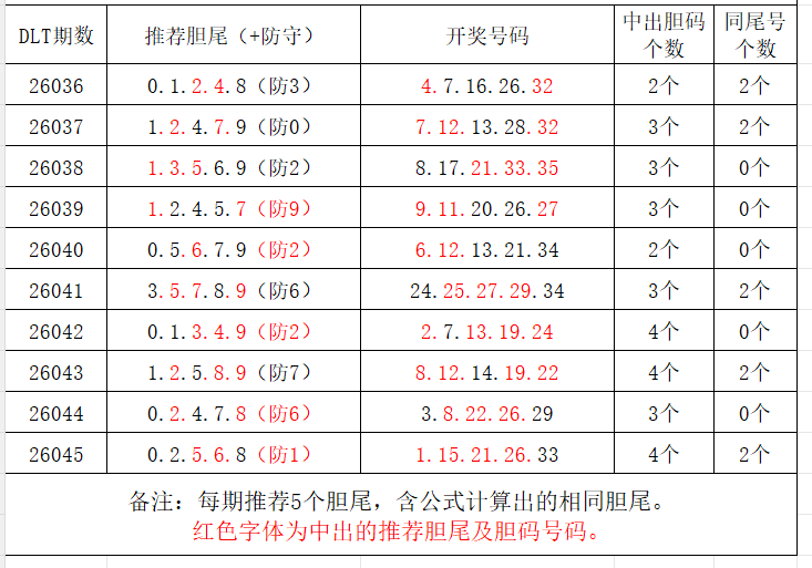 如图,每期推荐胆尾中出1-4个。上期推荐胆尾中出3尾4码!推荐胆尾是按照公式计算的顺序,不定位红球号码的顺序。本期推荐胆尾:5尾/7尾/9尾/4尾/0尾,加推防守胆尾+胆码号码:***(会员专区可见)。个人分析,仅供参考。