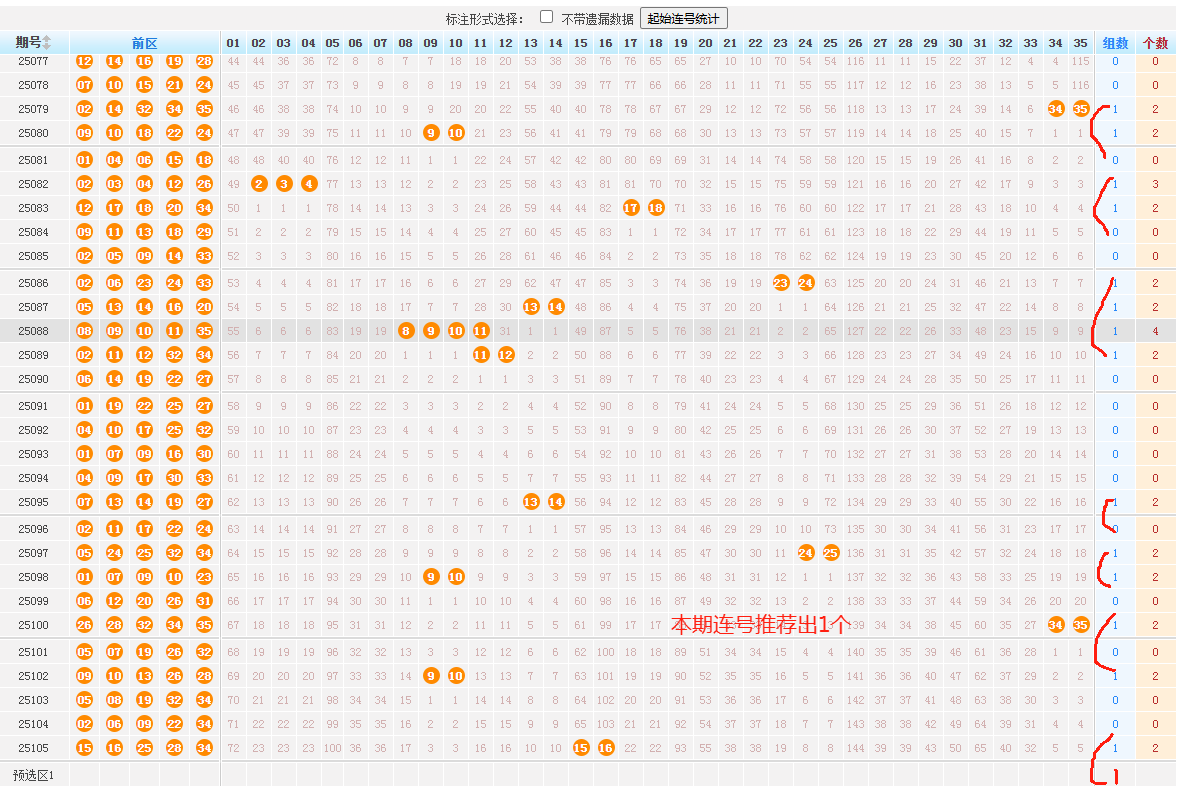 (这个数据已经连续出24期,历史最大出12期,已经超出极限值,上期出34,本期防出1个)