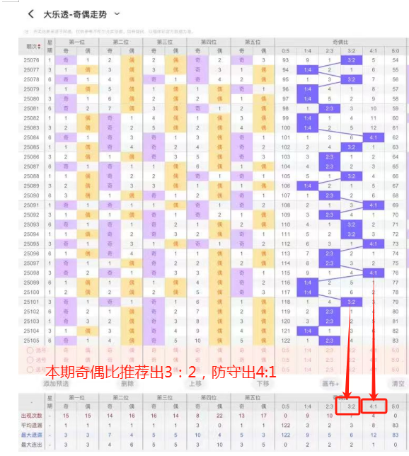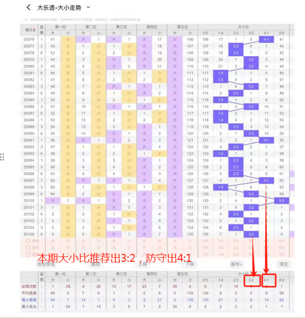 6、大小比:上期开出大小比为3:2,近62期开出4:1出现18次,3:2出现25次,2:3出现38次,1:4出现22次,5:0出现3次,本期推荐出3:2,防守出4:1,本期重点推荐出3:2。