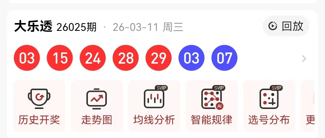 上期大乐透前区奖号开出03 15 24 28 29+03 07。前区的奇偶比为3:2,大小比为3:2,012路比为3:1:1,三区比为1:2:2,和值为99,跨度为26。后区则为一小一大号的组合,这些数据为我们接下来的分析提供了基础。