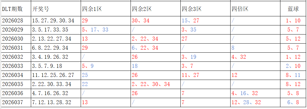 如图,红色字体是重复开出的号码,即为热号。蓝色字体是开出一次的号码,即为冷号。区间走势由冷及热,由热及冷,达到区间平衡。以近10期为一个分析周期:4余1区、4倍数区,走势较冷;4余2区、4余3区,走势较热。依据久热必冷,久冷必热的规律,本期重点关注:4余1区、4倍数区,区间号码可能开出2-3个;4余2区、4余3区,区间号码可能开出1-2个。区间冷热号码精选:***(会员专区可见)。个人分析,仅供参考。