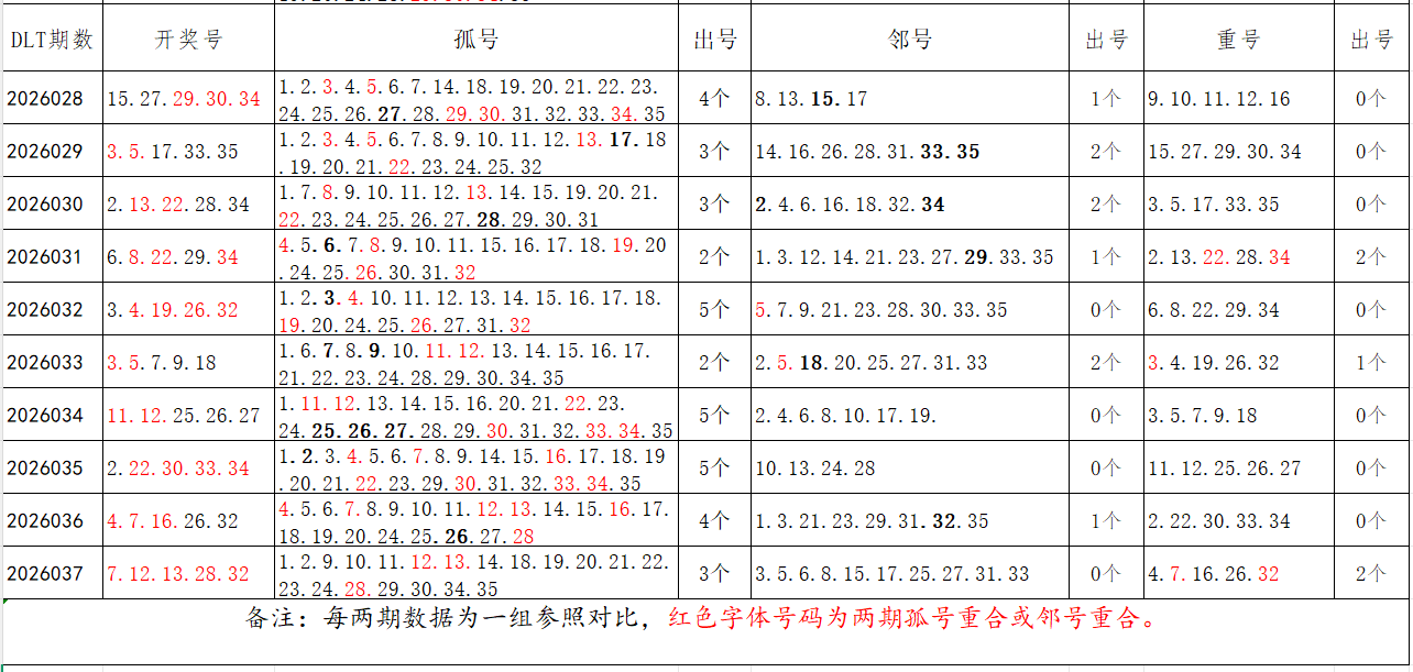 如图,以近两期数据为一组,进行对比分析,相同的孤号、邻号可能在下期开出。本期参考孤号:1.2.3.4.5.9.10.15.16.17.18.19.20.21.22.23.24.25.26.30.34.35;邻号:6.8.11.14.27.29.31.33。重点关注:孤邻号重合号码:***(会员专区可见)。个人分析,仅供参考。
