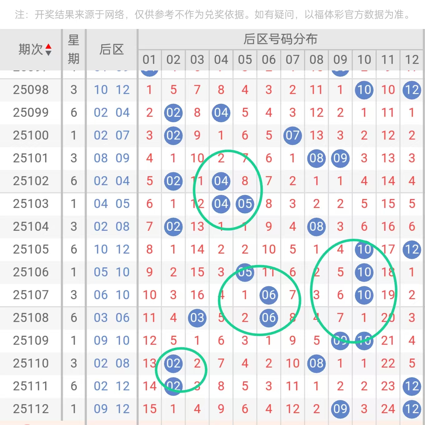 后区号码平均出现频率为46/12≈3.83次,因此出现4次及以上视为热号,3次为温号,2次及以下为冷号。从最新期2025112起的遗漏值如下:
