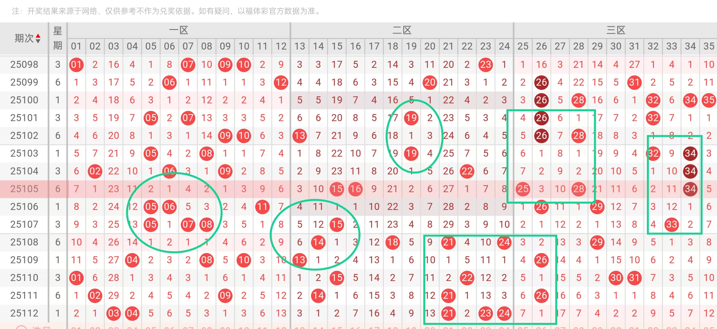前区号码平均出现频率为115/35≈3.29次,因此出现4次及以上视为热号,3次为温号,2次及以下为冷号。同时,计算从最新期2025112起的遗漏值(即号码未出现的期数),遗漏值高的冷号可能回补,遗漏值低的热号可能持续出现。关键遗漏值如下: