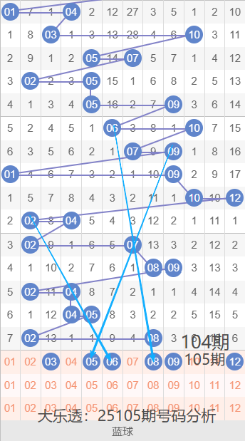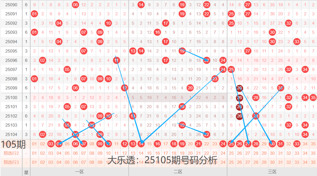 通过上期号码的简单分析,我们看下25105期红色号码球的总体走势,如下图:
