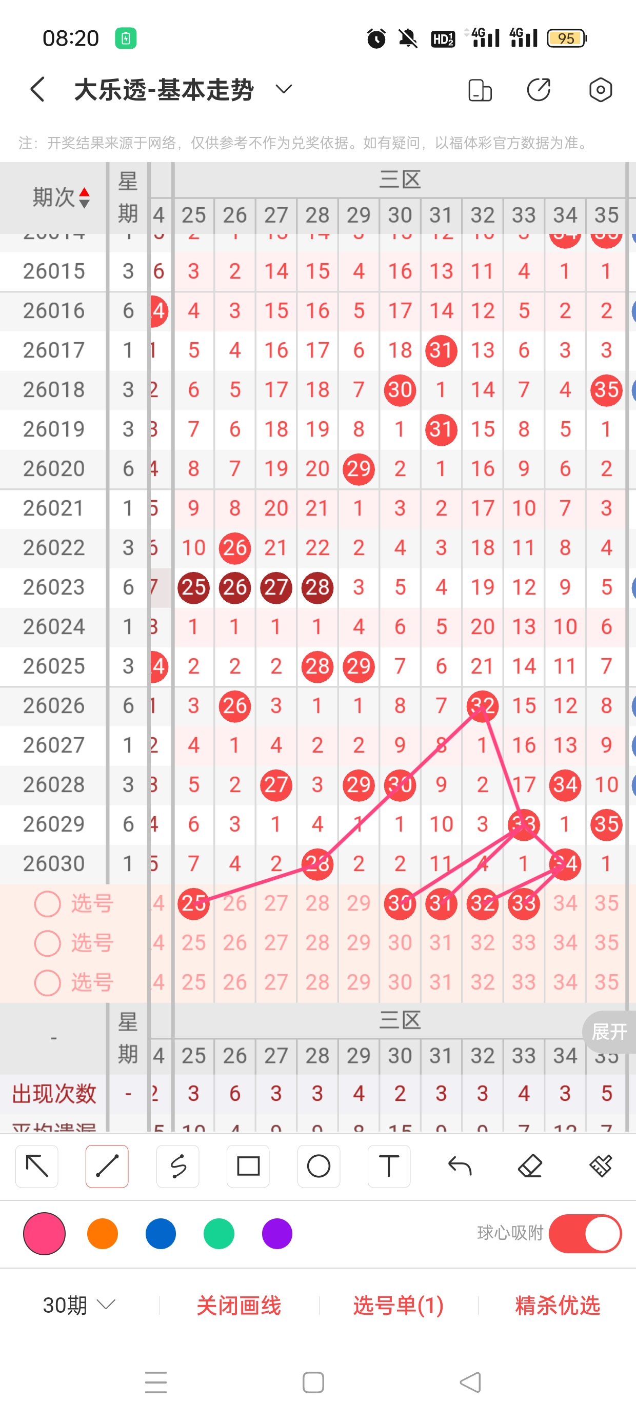 三区(25-35)近34期本区邻孤传12邻23孤0传,孤号热度高,本期着重邻传。近34期本区012路8:8:20,2路热度高,本期着重0/1路。25已遗漏7期,与28之间呈现向左遗漏递减态势,需防。30、31分别遗漏2期、11期,两者与33之间呈现向左遗漏递减态势,需防。32、33分别遗漏4期、1期,两者与34之间呈现向左遗漏递减态势,需防。