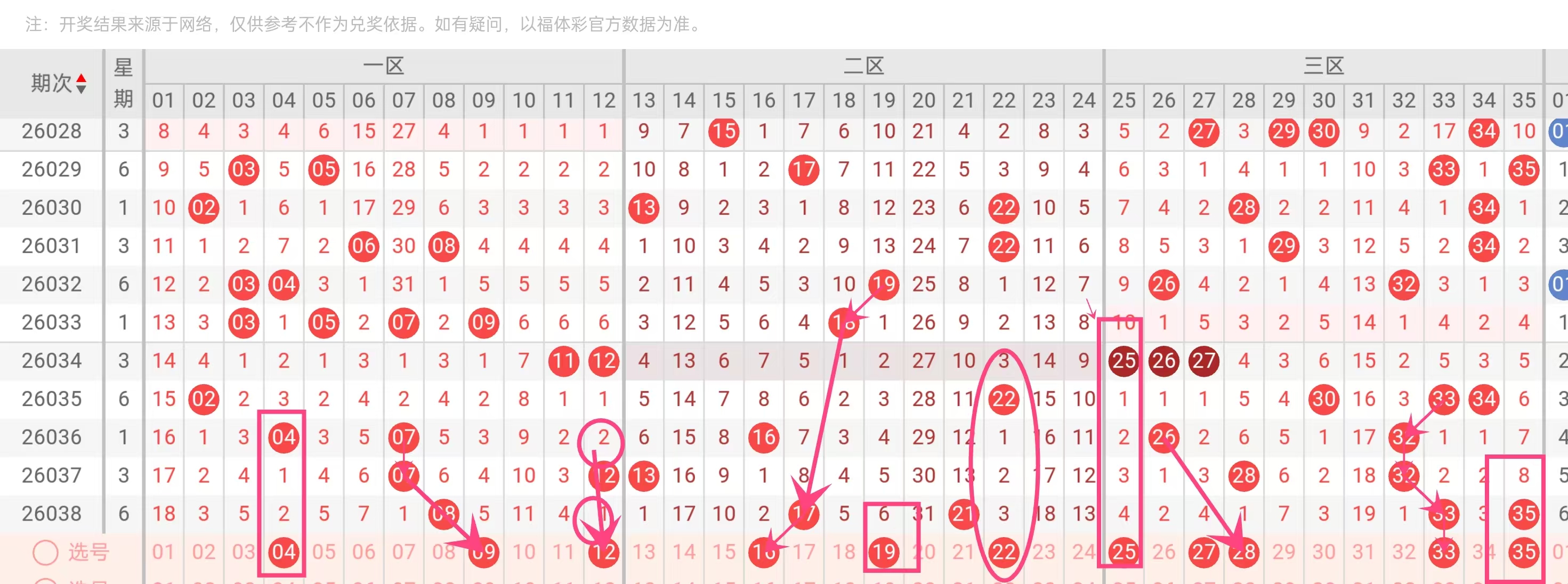 前后区关联:前区有04、09、12、16、19、22、25、27、33、35,后区有02、03、07、08、12。前后区同号12出现,形成联动。前区尾4、9、2、6、5、7、3等,后区尾2、3、7、8、2,部分重叠。