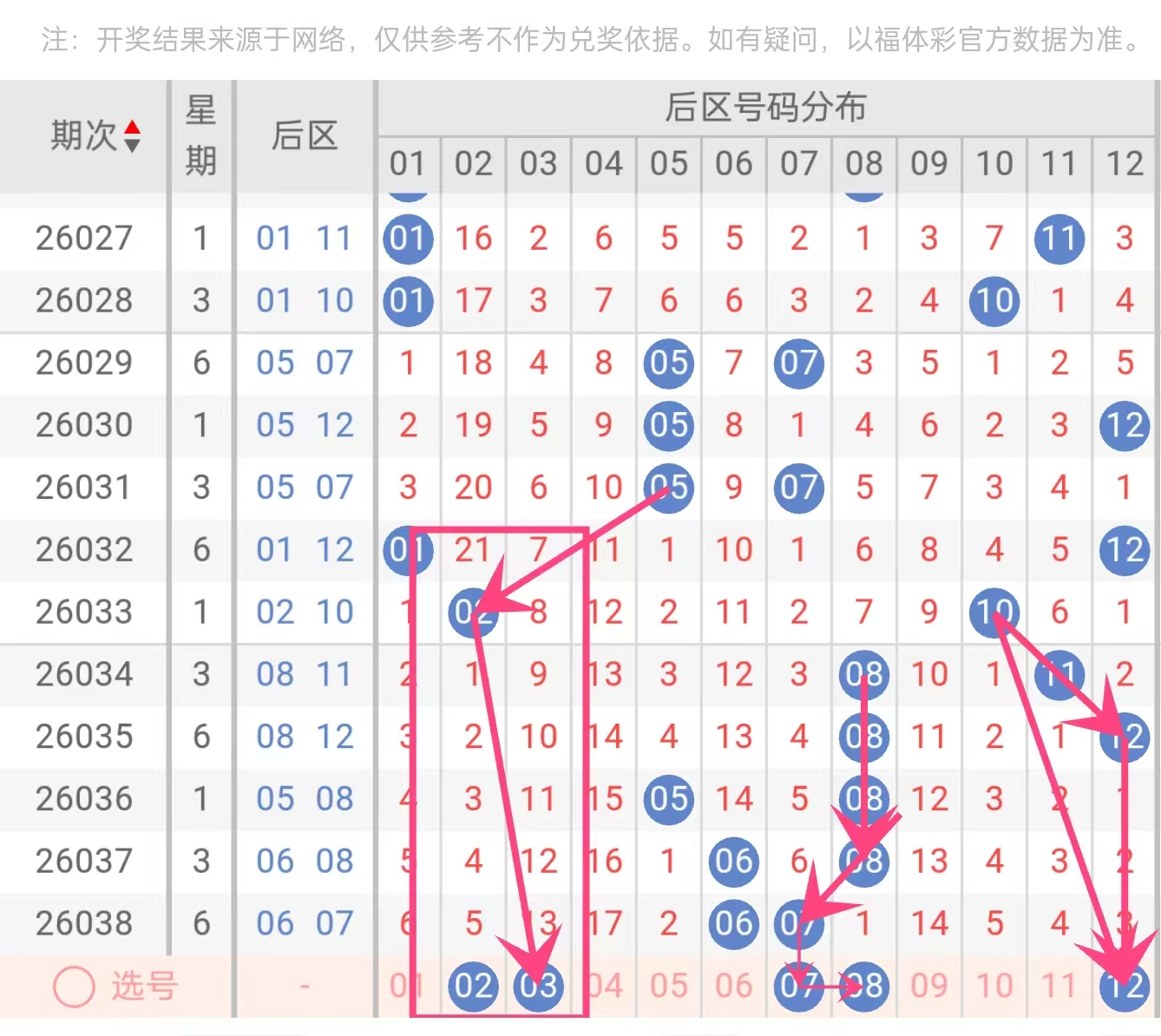 大小与奇偶:小号(≤06):02、03;大号(≥07):07、08、12。比例2:3。奇数:03、07;偶数:02、08、12。单注可小大组合(02+07、02+08、02+12、03+07、03+08、03+12)或小小(02+03)或大大(07+08、07+12、08+12)。
